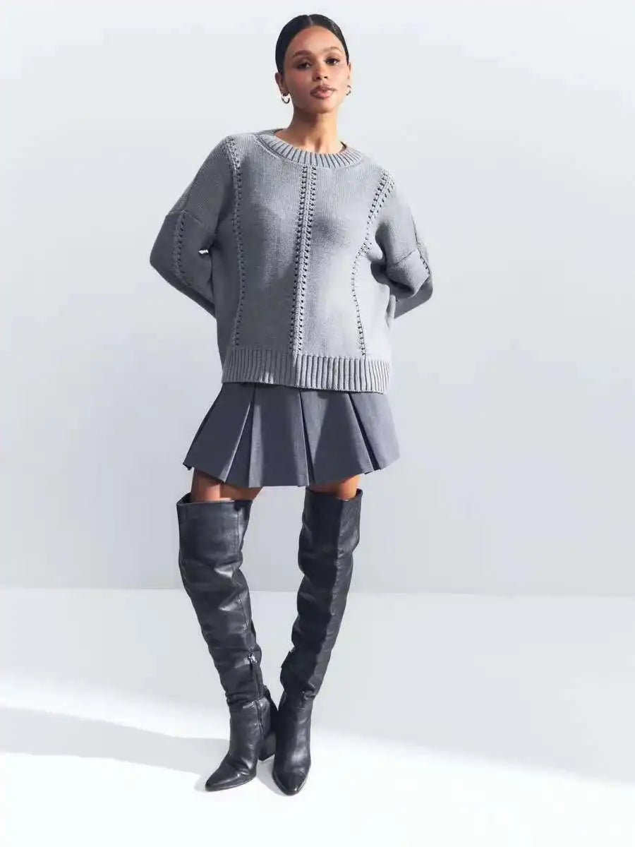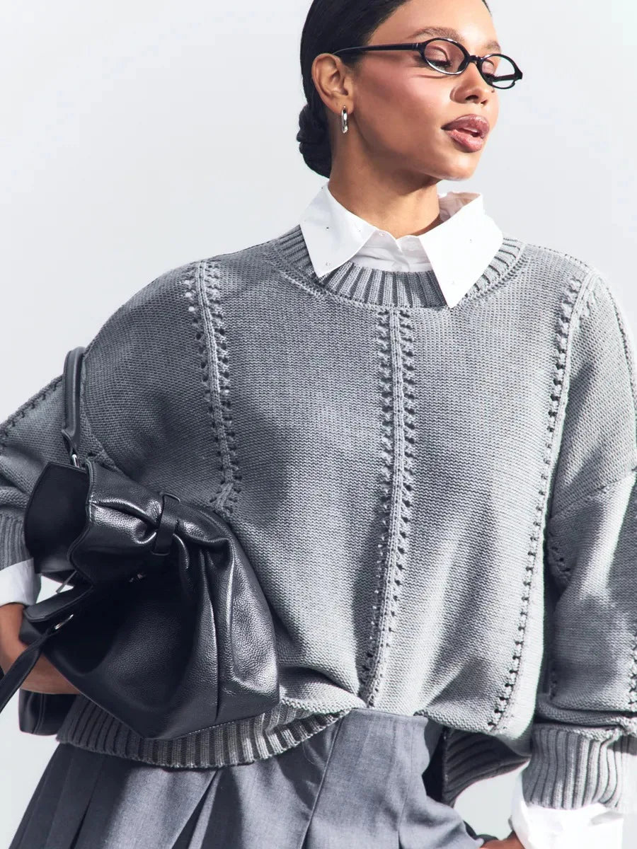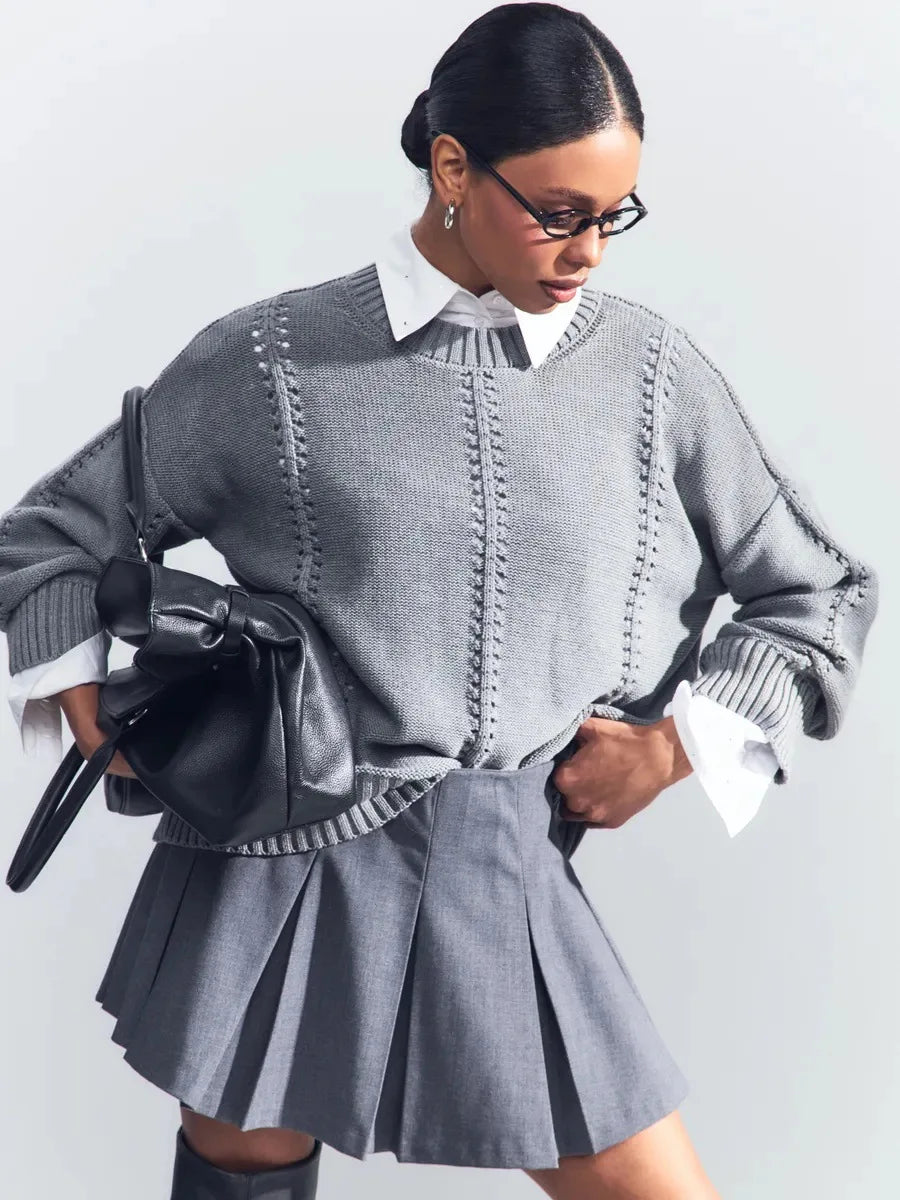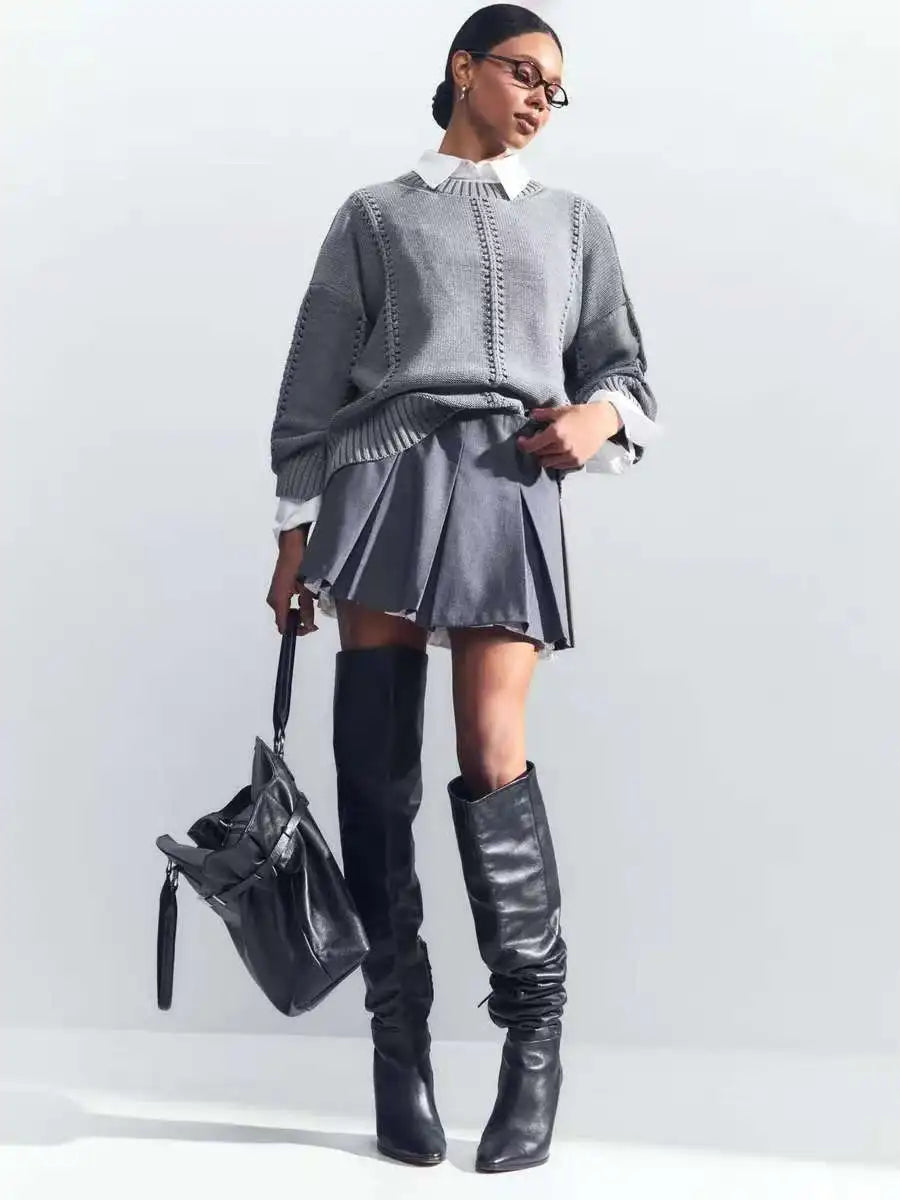 Whether you're styling it for a minimalist aesthetic, a Korean fashion vibe, or a smart casual look, this sweater offers endless versatility. Its timeless gray tone and detailed stitching add texture and depth, while the pleated skirt combination completes a polished outfit ideal for all seasons.