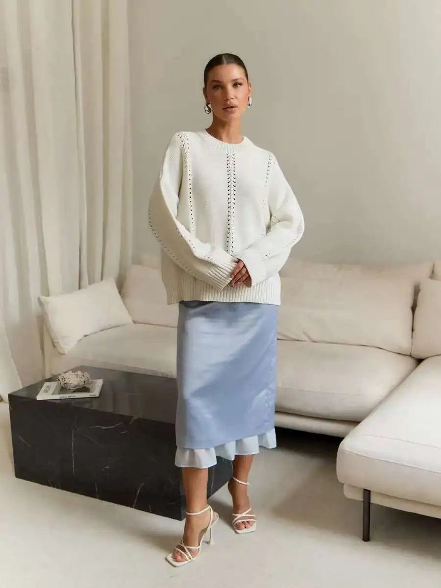Elevate your wardrobe with this chic knit sweater featuring a classic layered white shirt look. Designed for comfort and elegance, this cozy knitwear piece pairs beautifully with skirts or tailored pants for a modern preppy style. The soft, premium knit fabric ensures warmth and breathability, making it a perfect choice for office wear, casual outings, or autumn layering.