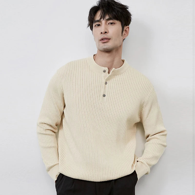 The ribbed knit texture not only adds depth and structure but also enhances flexibility and warmth. Its Henley-style button placket gives it a classic masculine appeal — perfect for layering or wearing on its own. Whether you’re heading out for a weekend brunch, a coffee date, or a relaxed office day, this cream pullover sweater keeps you effortlessly stylish and comfortable all day long.